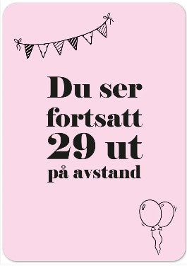 Bursdagskort. «Du ser fortsatt 29 ut på avstand. Ensides kort med hvit bakside. 10,5 x14,8cm...