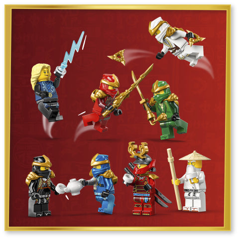 Jenter, gutter og nostalgiske ninja-fans fra 14 år kan markere 15-årsjubileet for LEGO® NINJAGO® TV-serien med settet 15-årsjubileumssett med ninja-figurer (71866) med åtte minifigurer. Dette fantastiske ninja-lekeklosteret har trapper, en port som kan åpnes, en steinlykt, et kirsebærtre i full blomst og et te-rom innerst med klistremerker av et berømt NINJAGO slag. Minifigurene er av karakterer fra sesong 1 av LEGO NINJAGO TV-serien: Kai, Zane, Cole, Jay, Lloyd, Wu og Samurai X, som alle er utstyrt med sitt eget våpentilbehør. I tillegg inneholder settet den aller første samlerminifiguren av Lynets mester på en egen sokkel, som kan kobles sammen med klosteret. LEGO NINJAGO serien med byggesett for barn inkluderer roboter, drager og templer, som fans kan bruke i actionfylt ninja-rollelek. Barn får god mestringsfølelse når de bruker LEGO Builder appens enkle, digitale instruksjoner for zooming, 3D-rotering og sporing av framdrift. Byggesettet består av 447 deler.