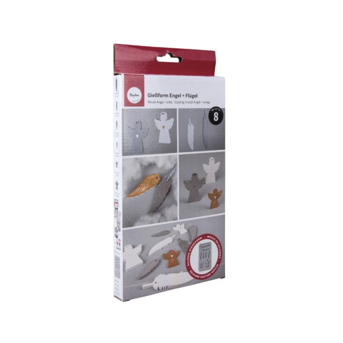 Silikonform måler 26 x 14,5 x 1 cm, med 8 forskjellige motiver. Dimensjoner på de 8 motivene: stor engel 7,5 x 6 cm, liten engel 5 x 4,5 cm, store vinger 7,5 x 2,5 cm, små vinger 5,5 x 1,8 cm, store fjær 12,5 x 3 cm, små fjær 9,3 x 2 cm (hver 8 mm dyp).