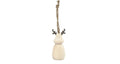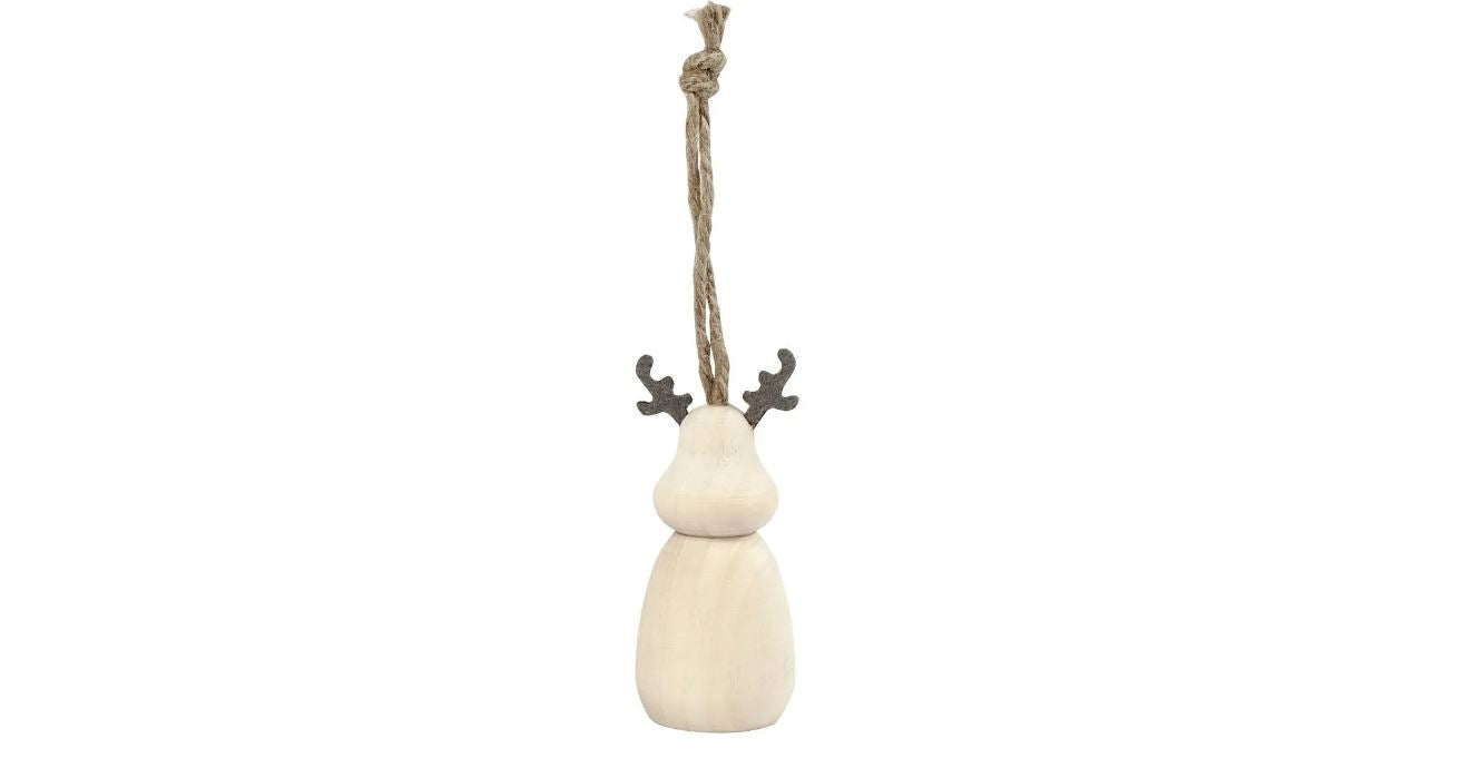 1 Stk., H: 7 cm, Dia. 3 cm - Reinsdyr i dreid lyst tre med gevir i brunt kunstlær samt opphengssnor. Figuren kan også stå