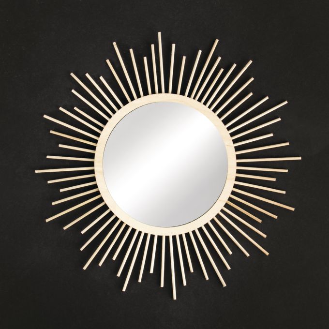 Tegn linjer og sirkler på treplaten med blyant, linjal og passer i henhold til instruksjonene og lim på trepinnene i henhold til instruksjonene. Speilet må limes på pinnene. Opphengskroken må festes på baksiden.