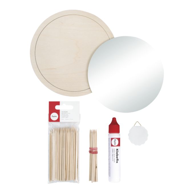 1 speilplate 15 cm ø, 1 treplate, 64 trepinner 10 cm, 1 opphengskrok, 1 Klebefix limstift. Den detaljerte veiledningen med ekstra trinnillustrasjoner viser deg steg for steg hvordan det gjøres.