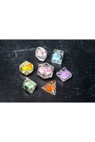 FanRoll resin dice have unique inclusions that add flare to any gaming table. These are full-sized 16mm polyhedral dice sets that come with 7 dice (d4, d6, d8, d10, d10%(00-90), d12, and d20).