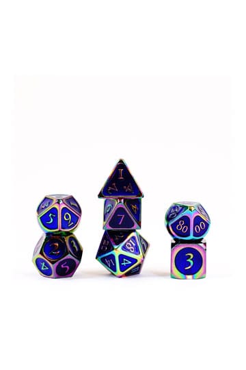 Upgrade your gaming experience! Made with solid zinc and plated with shiny-polished nickel, these 16mm metal dice sets are heavy in your hand, and are built to last. This is a full-sized 16mm polyhedral dice set that comes with 7 dice (d4, d6, d8, d10, d10 (00-90), d12, and d20).