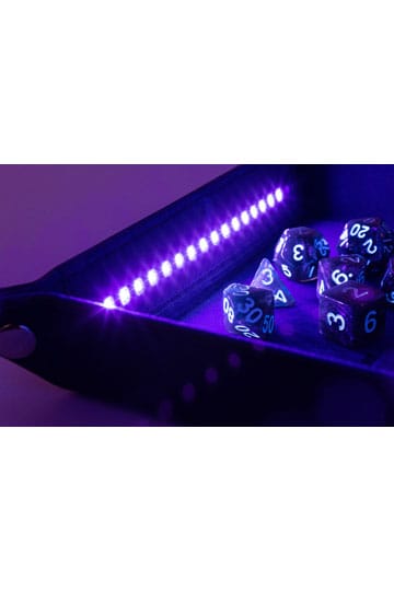 Introducing the newest technology to hit the tabletop, Shadowlight Dice Trays. These dice trays have black lights incorporated into the side of the tray to illuminate your tray. Each tray comes with a specialized D20 made to interact with blacklight and bring an incredible glow to your table. Tray's are built with auto-shutoff switches to save the batteries and these pair well with Shadow Light Elixir Dice.