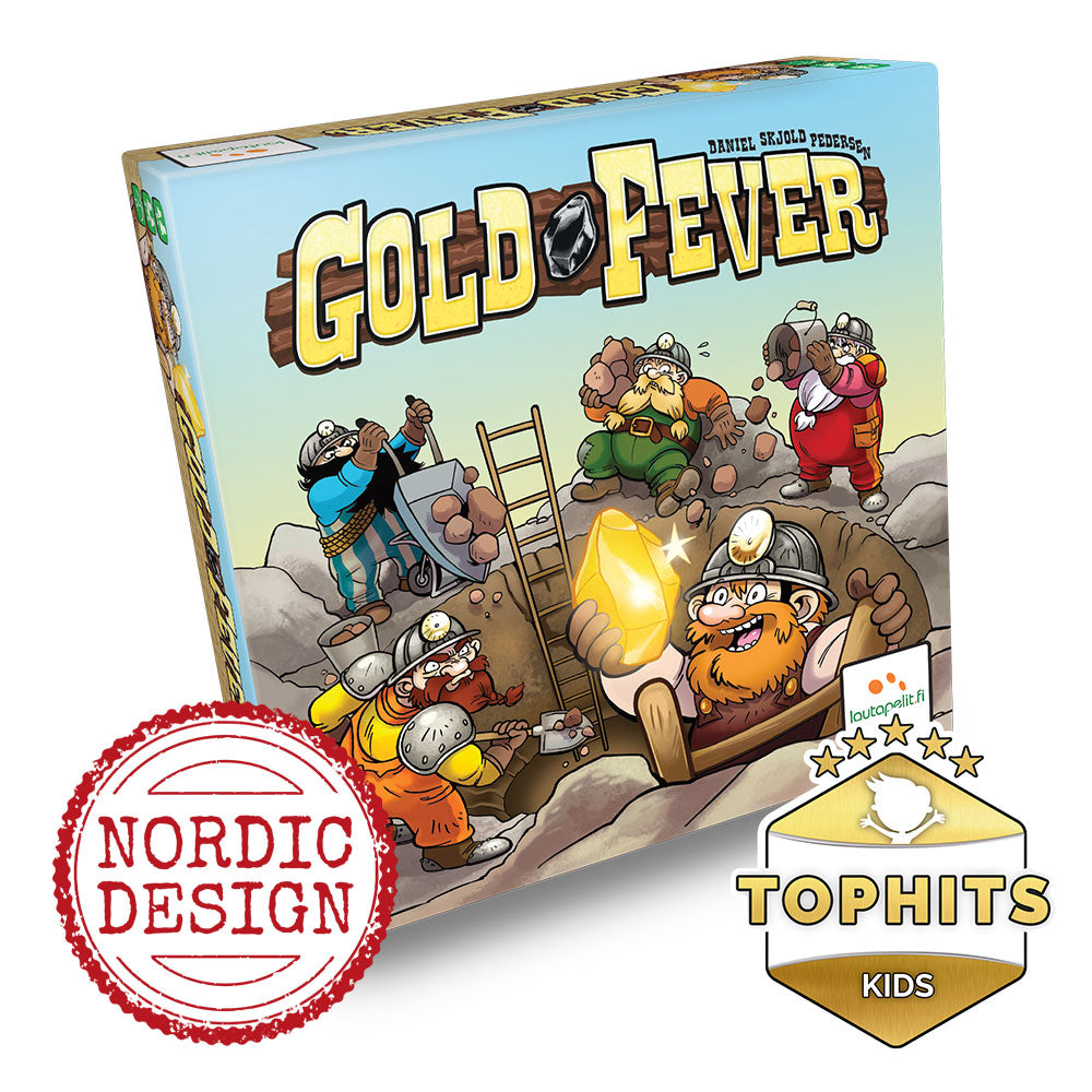 Den som først trekker fem gullklumper ut av posen sin i Gold Fever vinner spillet — men hvis du fortsetter å grave etter gull for lenge, risikerer du å trekke så mye grus at du kan miste alt! Gold Fever tilbyr morsomme beslutninger med umiddelbar gevinst på kort tid.