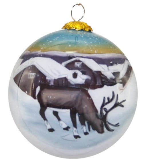 Julekulen er malt for hånd på innsiden av glasset gjennom det lille hullet i toppen. Hver kule kommer i en pen, rød gaveeske med gullskrift på. Da er det ekstra stas å gi bort i gave til noen du er glad i! I tillegg sørger boksen for at det er sikrere og finere å oppbevare kulen når den skal lagres