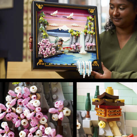 Med byggesettet LEGO® Art Landskap med japanske kirsebærtrær (31218) for voksne kan du fylle hjemmet ditt med fargerik natur. Denne slående, klossebygde veggkunsten i 3D er inspirert av den japanske vårens skjønnhet og Japans Ukiyo-e-kunstnere. Modellen inneholder Fuji-fjellet, et tehus, en bro, en foss, flygende japanske traner og kirsebærtrær, Sangokaku–lønn og japanske skjermtrær. Dette vakre kunstverket med svartlakkert skyggeramme og kan stilles ut på to måter: Det kan henges opp på veggen ved hjelp av opphenget bakpå eller plasseres fritt på et flatt underlag. Kunstverkets foss fortsetter forbi rammen, og kan justeres slik at fossen renner rett ned når kunstverket henger på en vegg, eller at den flyter utover når det står på et flatt underlag. Dette LEGO kunstsettet gir voksne en avslappende og dypt engasjerende byggeopplevelse, hvor de skaper botanisk veggkunst av LEGO klosser. Modellen inkluderer trinnvise instruksjoner som gir en kreativ byggeopplevelse, og passer som belønning til deg selv eller japansk gave til kunstinteresserte. Settet består av 1892 deler.