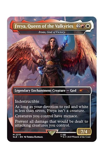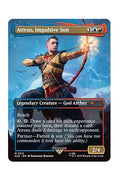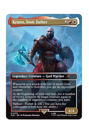 After carving a path of vengeance through Mt. Olympus, Kratos wandered for many years-eventually making his way to the mysterious Norse lands. Following the death of his wife, Kratos and his young son, Atreus, embark on a journey to honor her final wishes, entangling them with the Aesir gods and leading them on a path to eventually face the cataclysmic event of Ragnarök. Empower the father and son duo on the battlefield through Teferi's Ageless Insight as Mimir (the reversible treatment allows you to play either Mimir-in-a-tree or Mimir-as-a-head) and Iroas, God of Victory given form as the indomitable warrior, and "Freya, Queen of the Valkyries." Contents: 1x Atreus, Impulsive Son 1x Kratos, Stoic Father 1x REVERSIBLE Teferi's Ageless Insight as "Mimir's Ancient Wisdom" 1x Iroas, God of Victory as "Freya, Queen of the Valkyries"