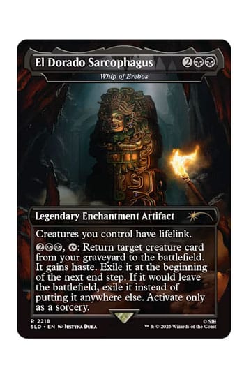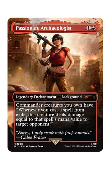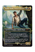 It's impossible to see Nathan Drake without hearing that iconic Uncharted score (IYKYK). Whether he's hanging from the back of a cargo plane, or hanging from the bottom of a crashed train that's derailed over a cliff, or hanging from a cliff by his bare hands, Nathan Drake will do whatever is necessary to claim his prize. Secret Lair x Uncharted brings the world's most reckless treasure hunter to Magic: The Gathering in style, with his roguish good looks brought to life on a brand-new Magic card design. If that wasn't enough, he finally gets to be surrounded by the many artifacts and treasures that he's after with the famed Whip of Erebos as "El Dorado Sarcophagus"-or maybe he'll just hang out and wait for the right time to make his move on Midnight Clock as "Kings Bay Clock Tower." Either way, he'll need some solid allies, like a Passionate Archaeologist, to ensure that there's honor among thieves. Don't leave him hanging. Contents: 1x Nathan Drake, Treasure Hunter 1x Midnight Clock as "Kings Bay Clock Tower" 1x Whip of Erebos as "El Dorado Sarcophagus" 1x Chain Reaction 1x Passionate Archaeologist