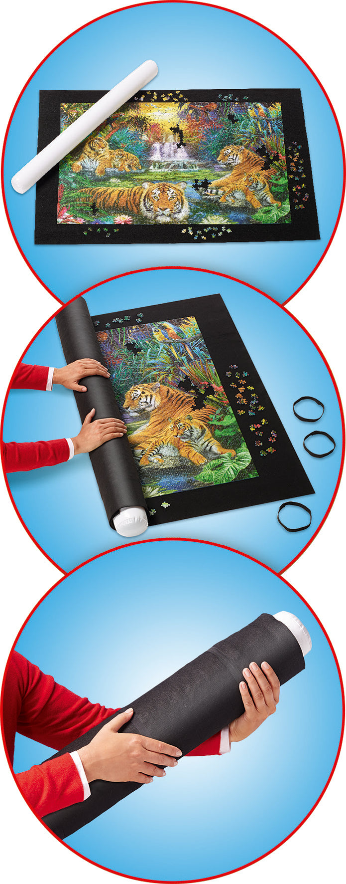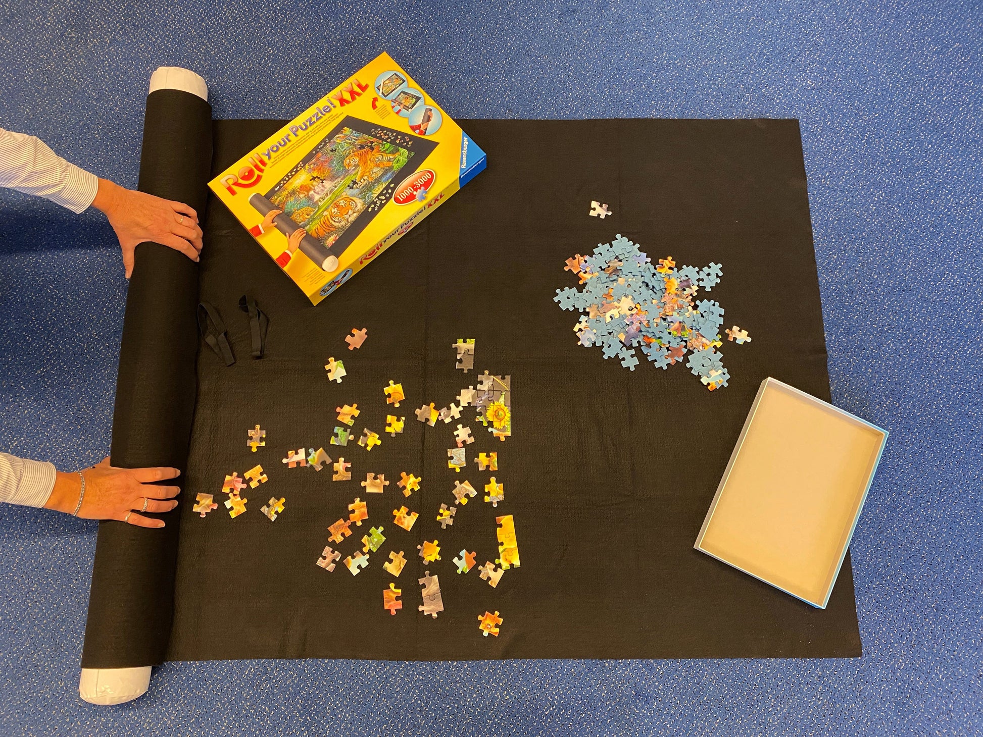 Puslespillet er laget direkte på feltmatten. For lagring er det bare å blåse opp plastrøret, rulle matten rundt den, med puslebitene inni, og sikre det med de inkluderte gummibåndene.